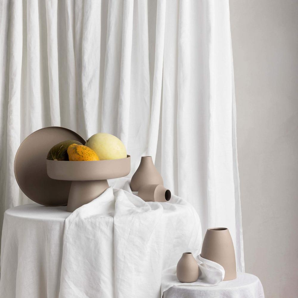 The iron Mona Pedestal’s beautiful curved lines and matte finish on the outside contrast beautifully with a glossy interior. Mix and match different sizes and colours from the Mona collection to create stunning silhouettes for your floor, sideboard, or tabletop.