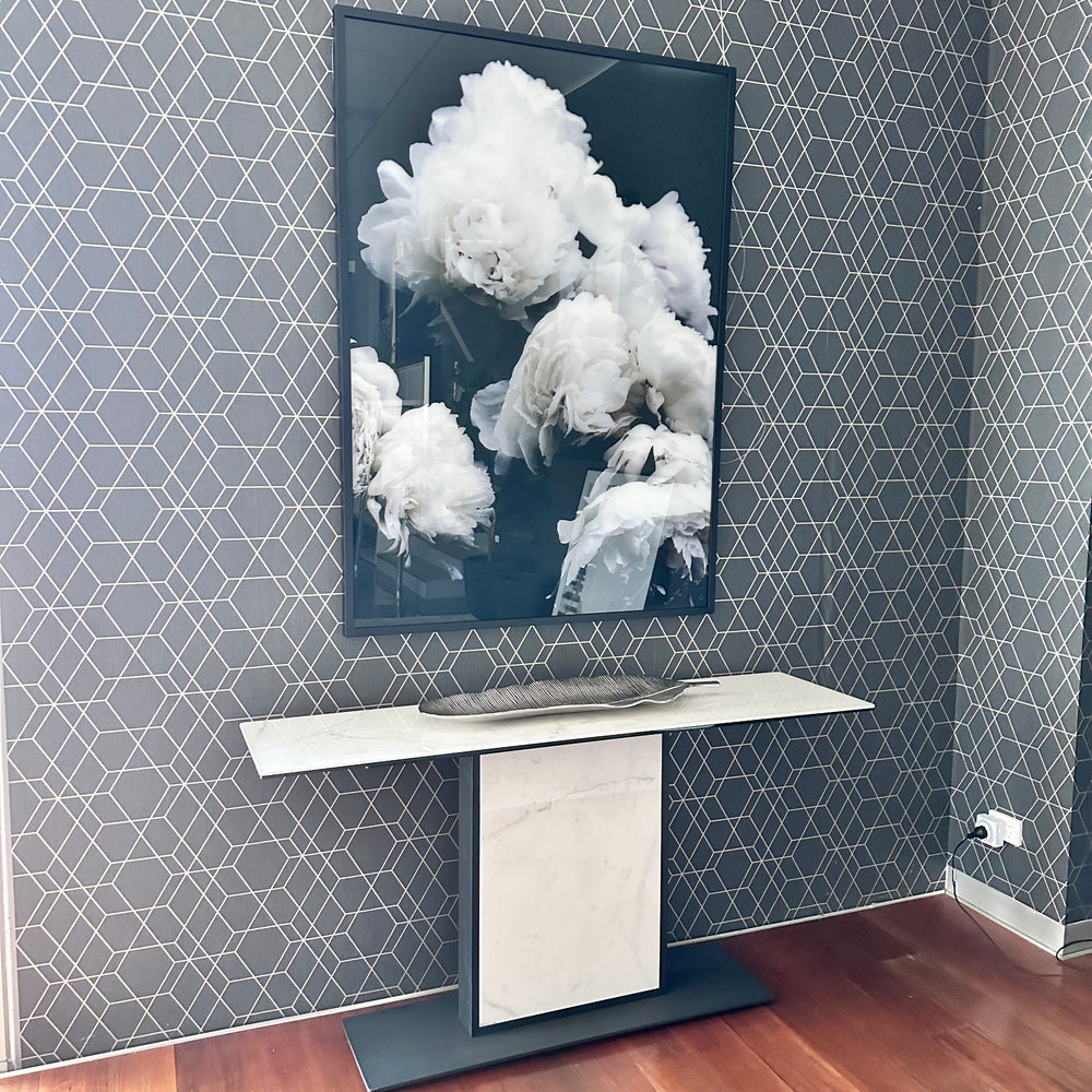 Elevate your walls with the Moody Floral Print on Glass, a striking piece measuring 140cm x 103cm. Originally priced at $930, now offered at a clearance price of $700. In as new condition, this artwork adds depth and sophistication to any interior. View it at our Thomastown showroom.