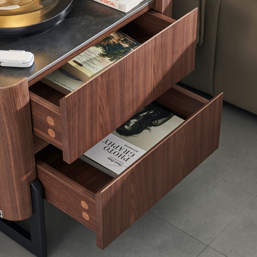 Add a touch of elegance to your living space with the Ankara Side Table. Featuring a chic Vixon stone top and a warm walnut timber base, this side table combines luxury with functionality. The soft-close drawers provide smooth and silent operation, while the sleek satin black legs offer a contemporary finish. Ideal for both style and convenience, the Ankara Side Table enhances any room with its sophisticated design.