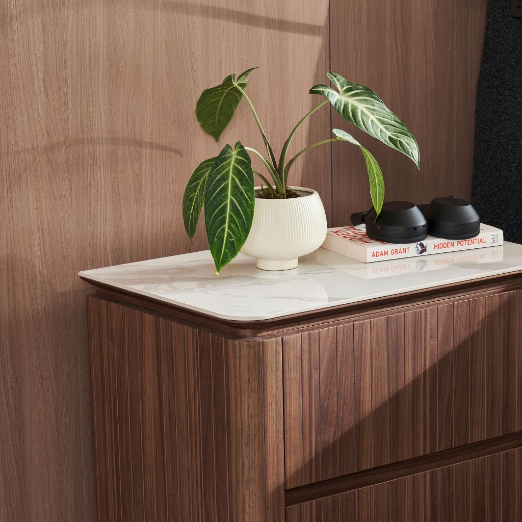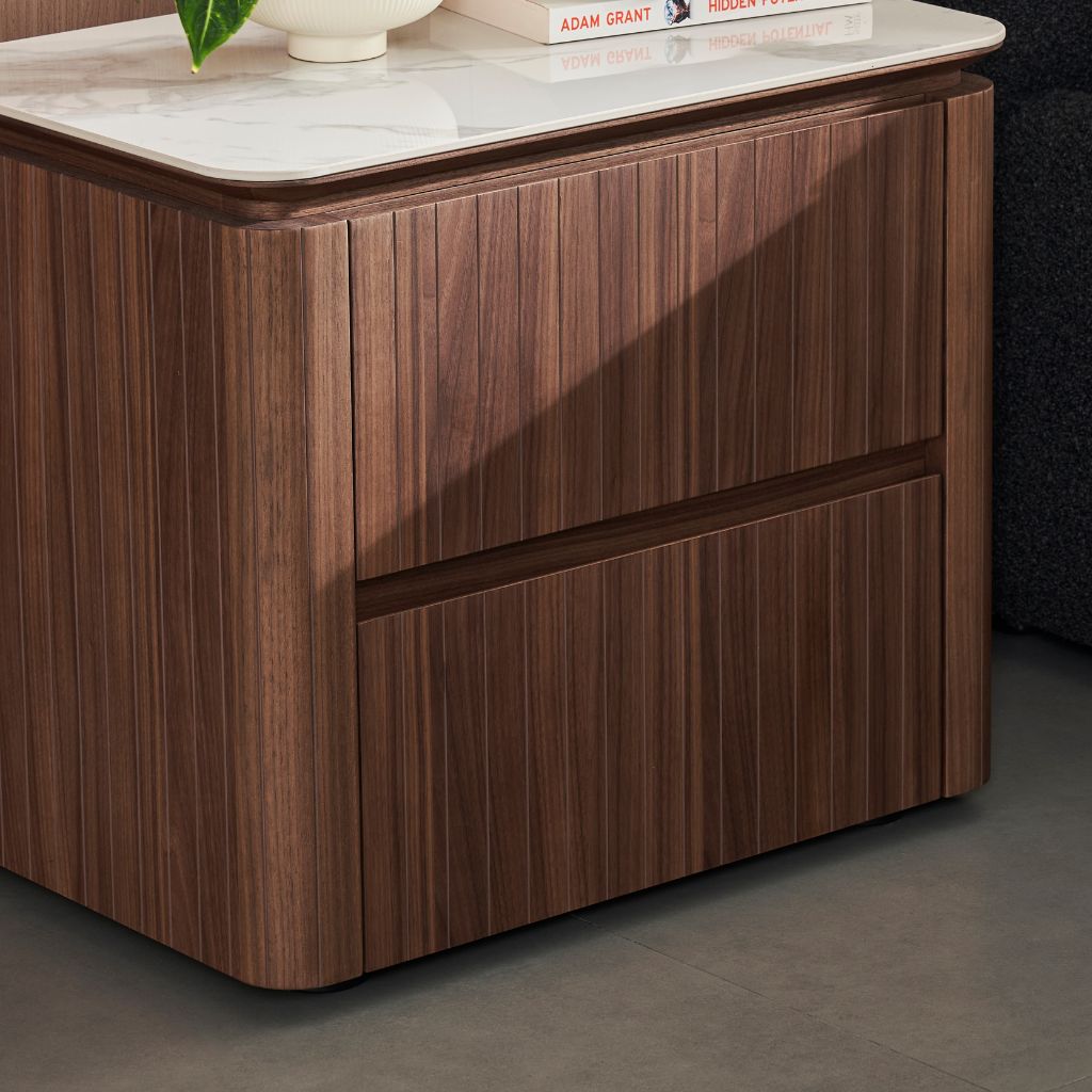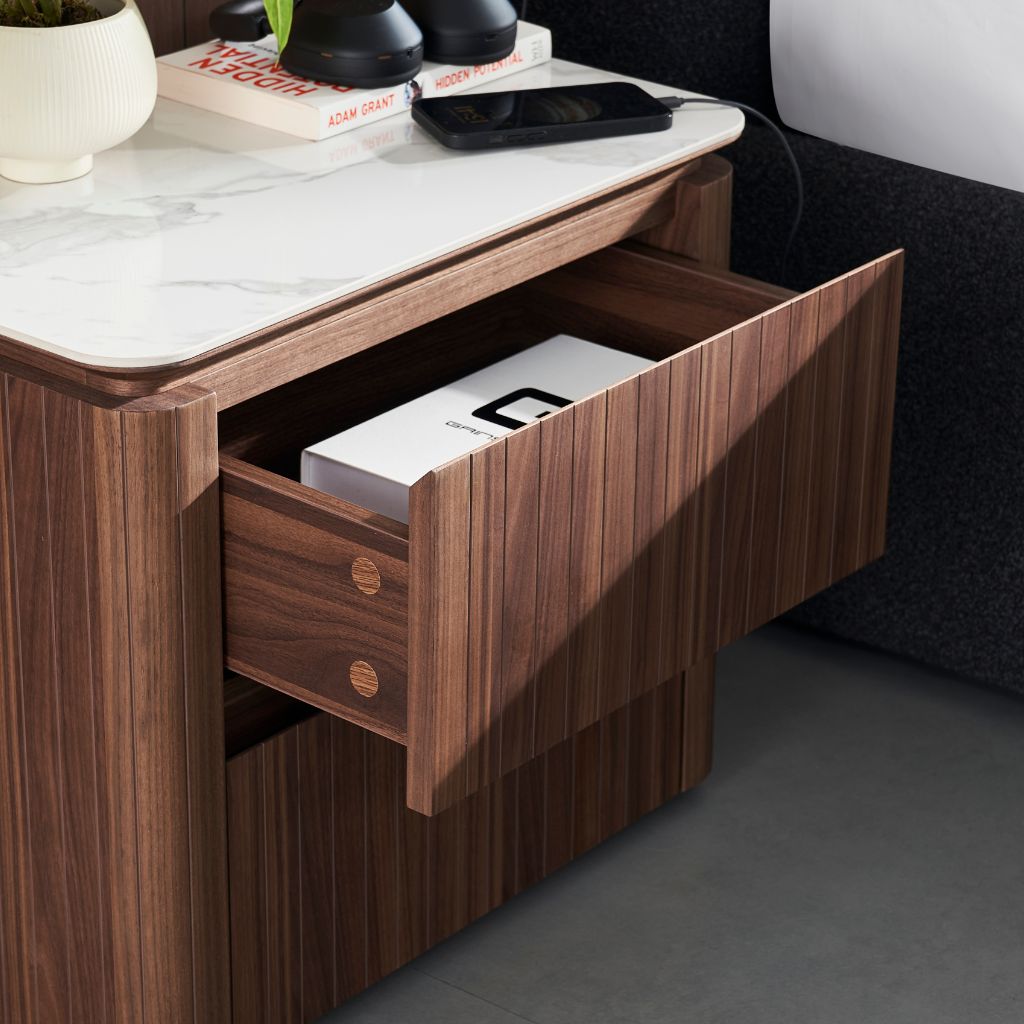Crafted with a warm American walnut veneer, the nightstand radiates natural sophistication. Its rich woodgrain texture adds depth and character, making it a seamless fit for both modern and classic interiors.
