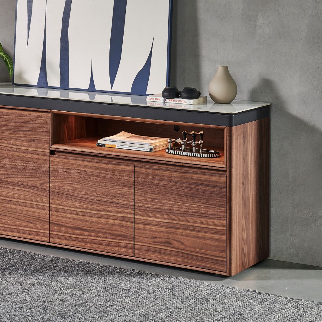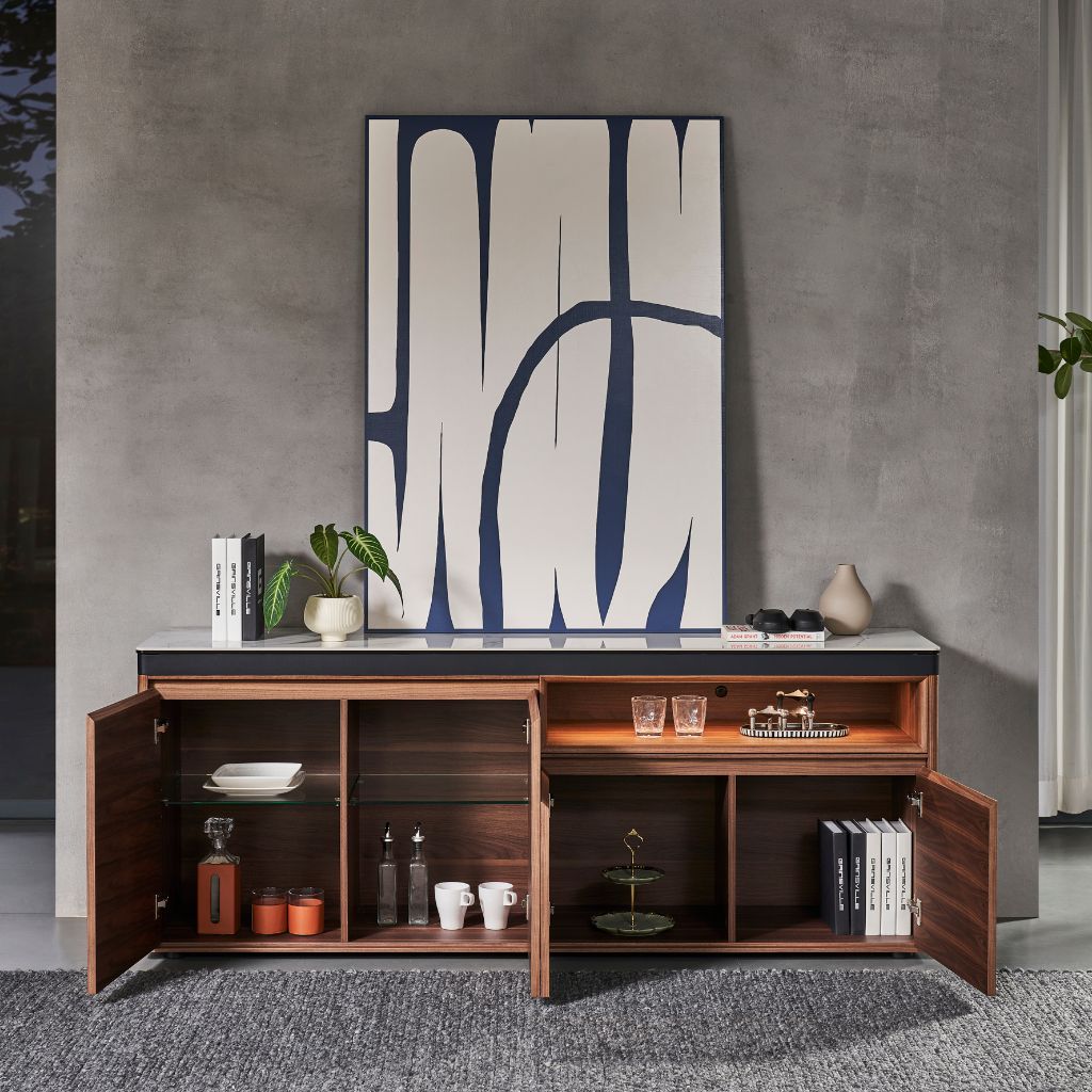 The Ezra Buffet embodies contemporary sophistication with its blend of rich walnut timber, pristine bianco ceramic, and luxurious Venice marble. Crafted for the discerning eye, this buffet seamlessly integrates style with functionality. The warm tones of the walnut timber add a natural charm, while the bianco ceramic top brings a touch of modern elegance, making it a versatile piece that complements various decor styles.