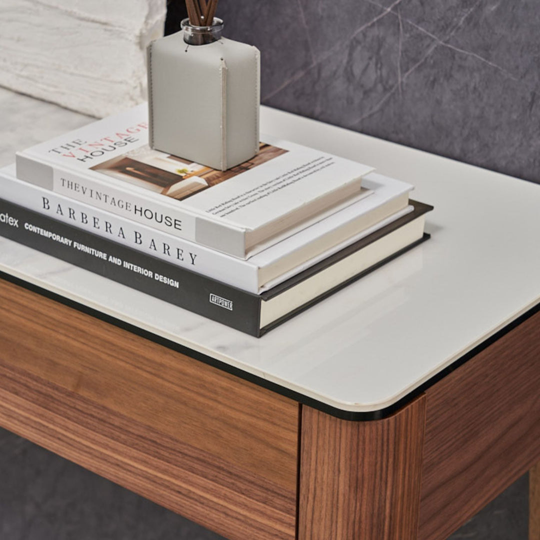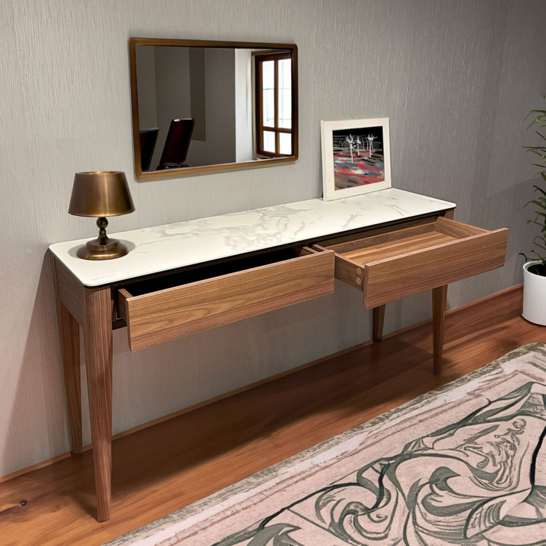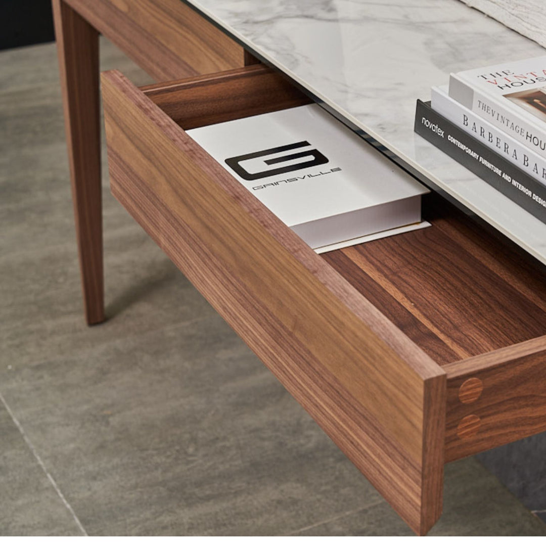 Tapping into the power of bold ceramic and the elegance of American Walnut, the Alaska Hall Table offers both beauty and purpose. Its non-porous ceramic top ensures long-lasting protection while two drawers offer convenient storage ability. Embrace the perfect mix of form and function with this unforgettable piece.