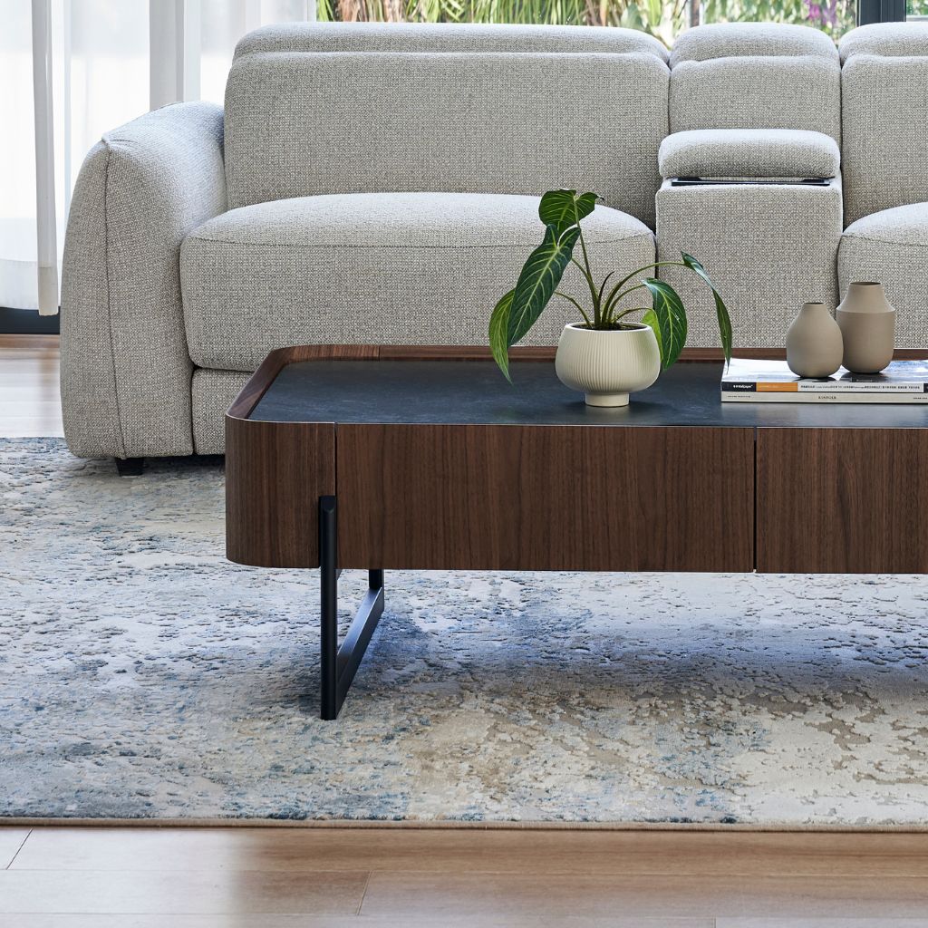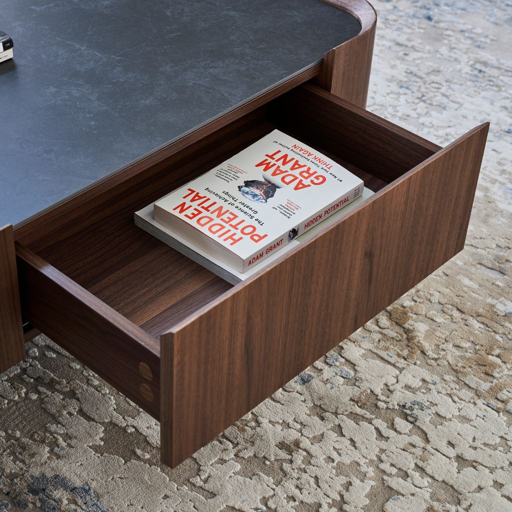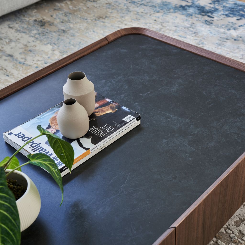 Elevate your living area with the Ankara Coffee Table, showcasing a sophisticated Vixon stone top and a warm walnut timber base. This stylish coffee table features soft-close drawers for smooth, quiet operation and is supported by sleek satin black legs. Combining elegance and practicality, the Ankara Coffee Table is perfect for adding a touch of luxury to your home with its luxury furniture design.