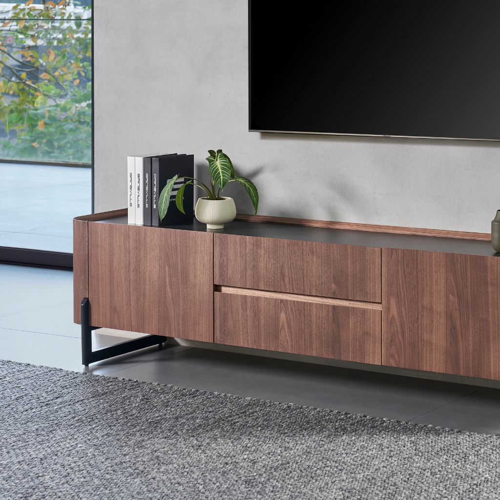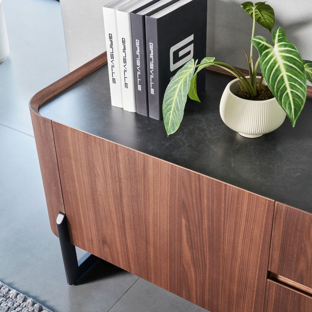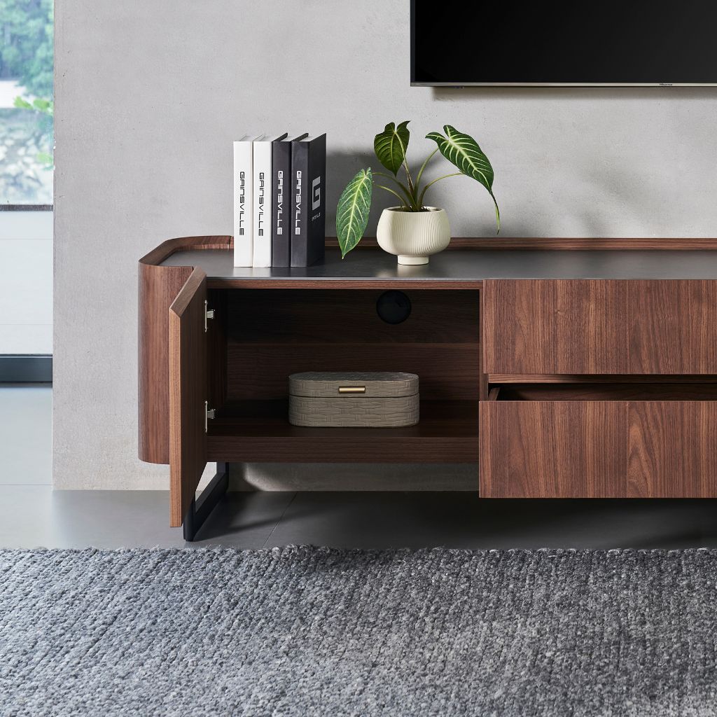 This media console combines a rich walnut wood body with a black stone top, offering a refined aesthetic that complements modern living spaces.