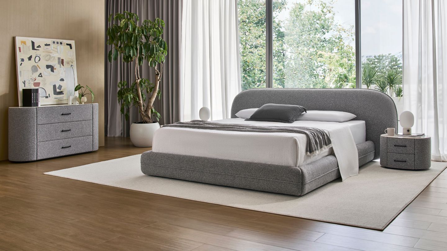 The Caleb Bed brings together modern elegance and soft comfort in one beautifully curved design. Its fully upholstered frame and rounded silhouette create a welcoming presence, while the low-profile form adds a sense of spaciousness to any bedroom. The curved headboard introduces a refined sculptural touch, making it a perfect centrepiece for contemporary interiors.