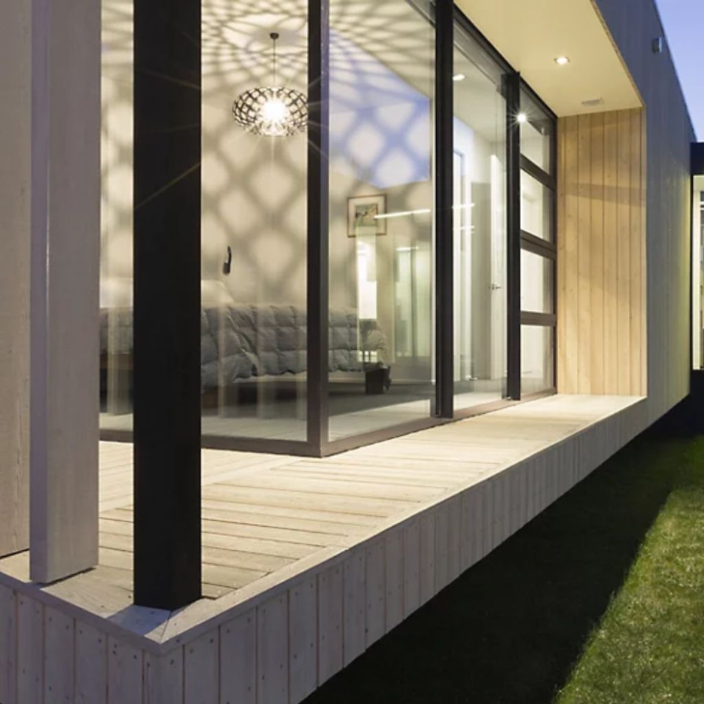 Kina lights aren't limited to indoor spaces—seen here beautifully from the outside, they bring a welcoming glow that complements the architecture. Their unique woven design enhances any setting, connecting indoor comfort with outdoor charm.