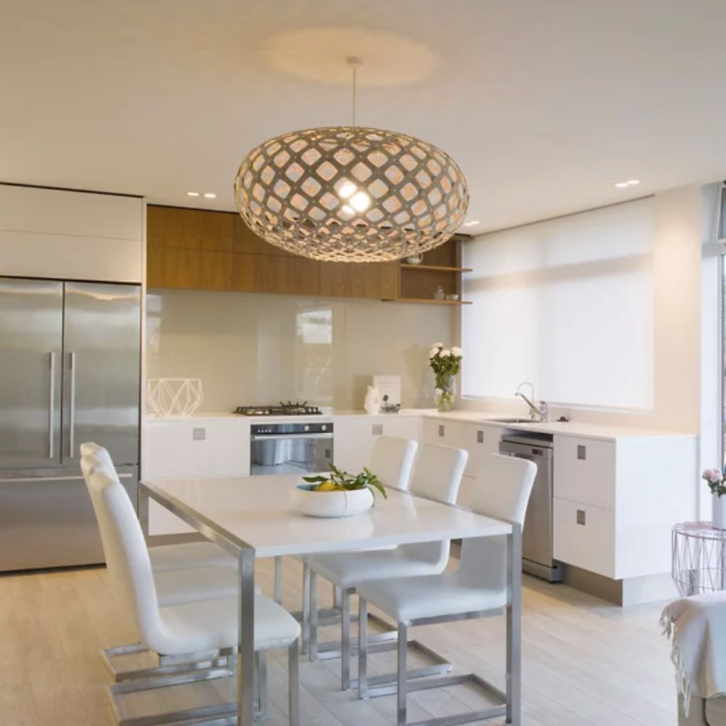 The Kina light makes a bold yet refined statement above the dining table. Its open, airy form allows for clear illumination, adding both function and a touch of artistry to the kitchen or dining area, perfect for contemporary interiors.