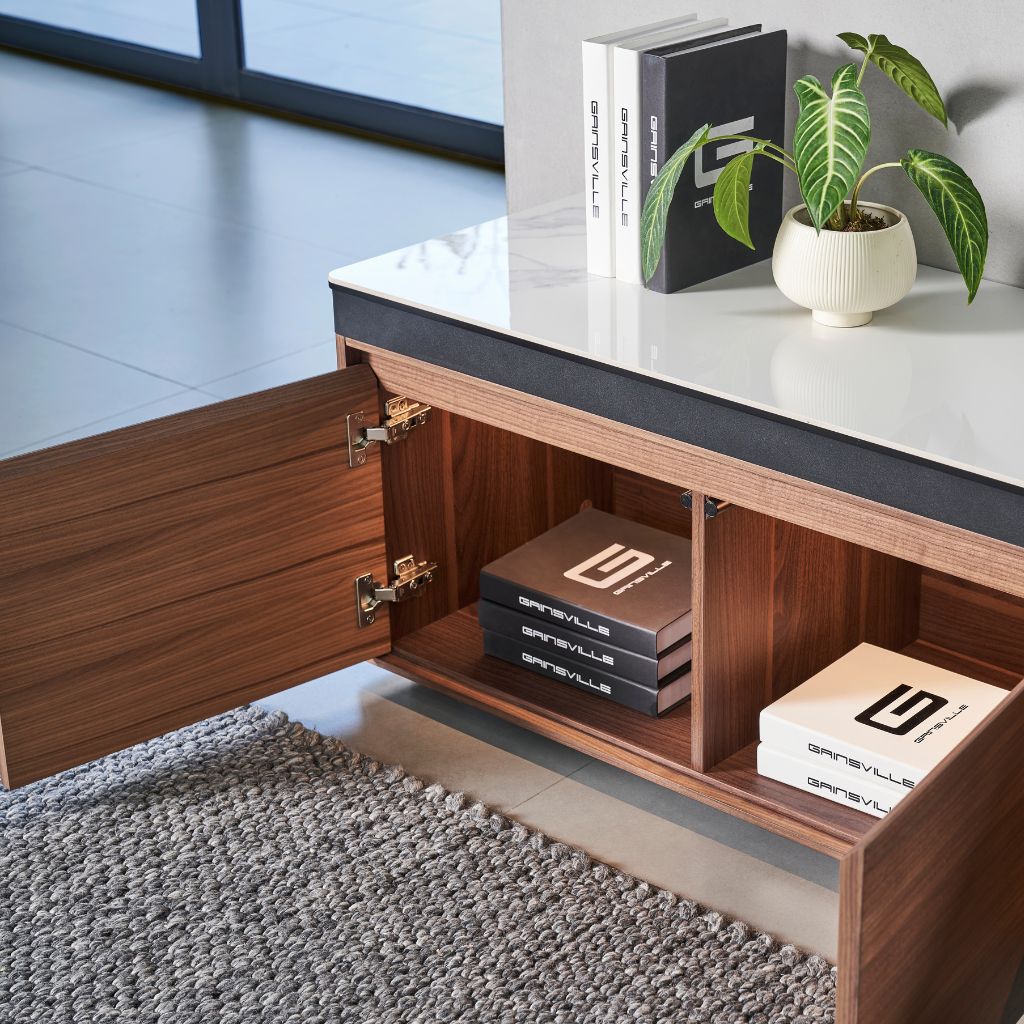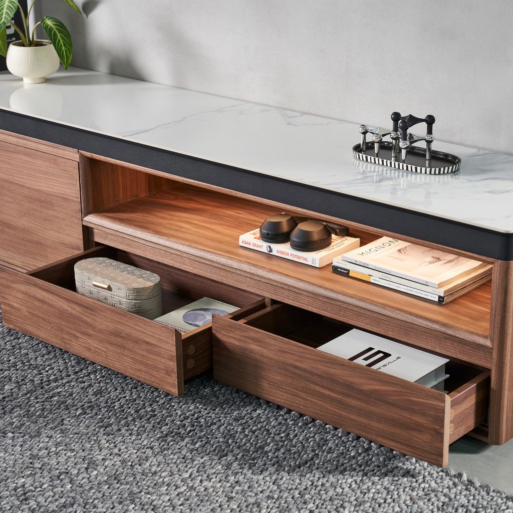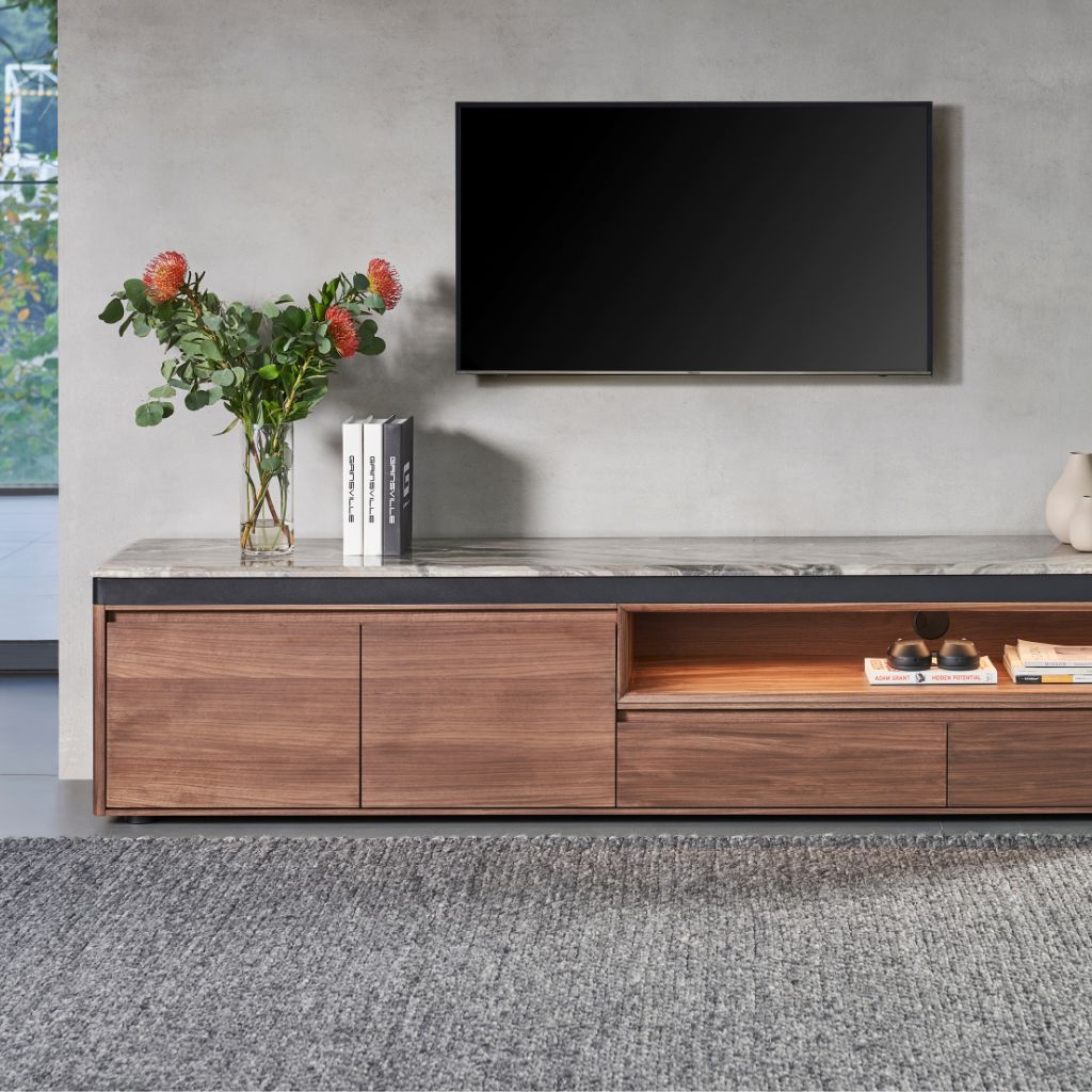 Introducing our sleek Ezra TV unit, blending Walnut Timber and Venice Genuine Marble for a modern, luxurious touch. This modern TV unit features soft-close storage compartments, it keeps your space organized effortlessly. Plus, integrated LED lighting enhances the ambiance for cozy nights in or entertaining guests. Elevate your living space with this sophisticated, functional centerpiece. Visit our furniture store in Melbourne to explore it further.
